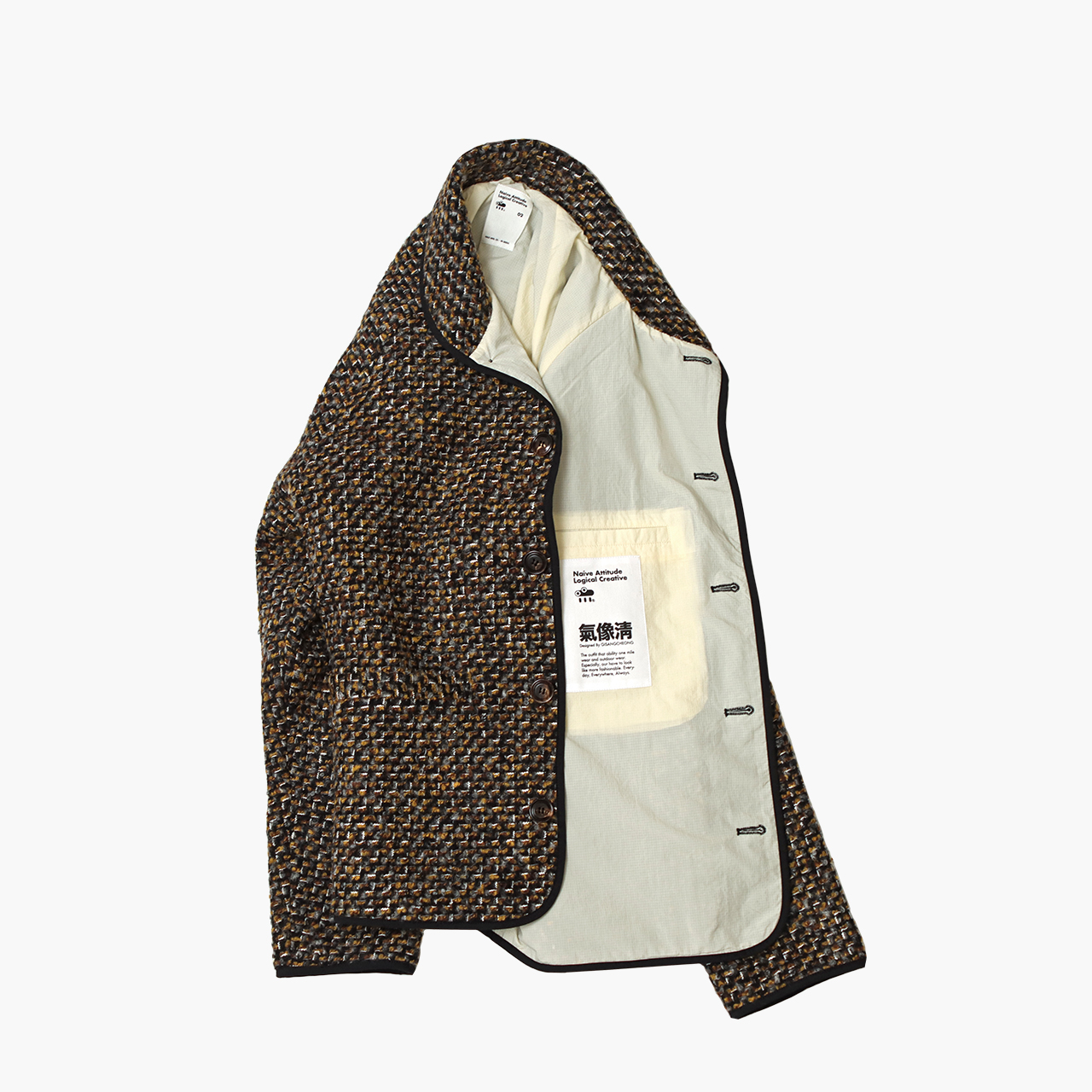나일론 립(RIP) 원단을 안감으로 사용하여 보온성과 착용감이 좋고 칼라부터 소매 끝단까지 파이핑 마감하여 자칫 풀리기 쉬운 트위드 방직의 단점을 잡았습니다. 오묘한 광택과 질감을 가진 천연 소뿔 단추를 사용하였습니다.