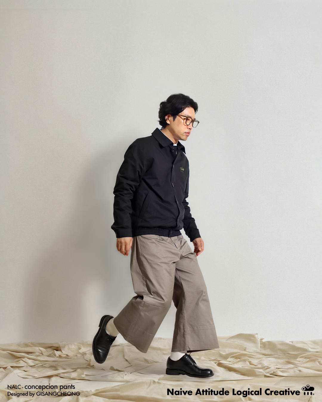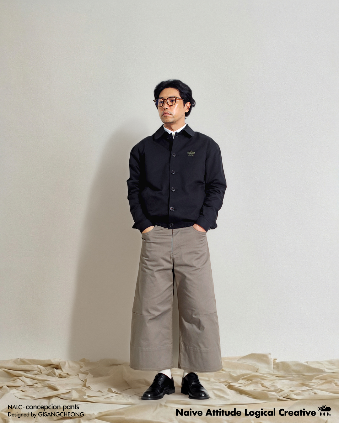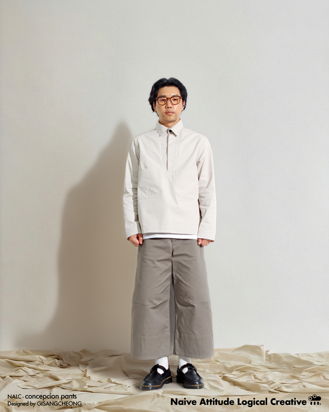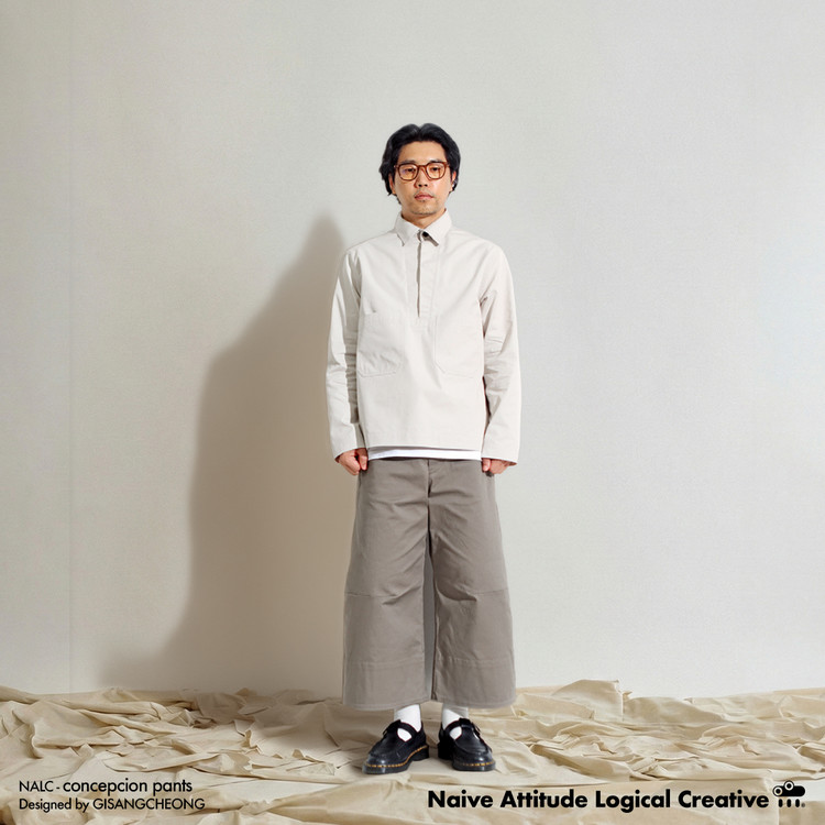 ✔️ 발목 위로 올라오는 총장과 무릎 부분부터 밑단까지 꺽어지며 흐르는 실루엣이 독특한 와이드 팬츠입니다.